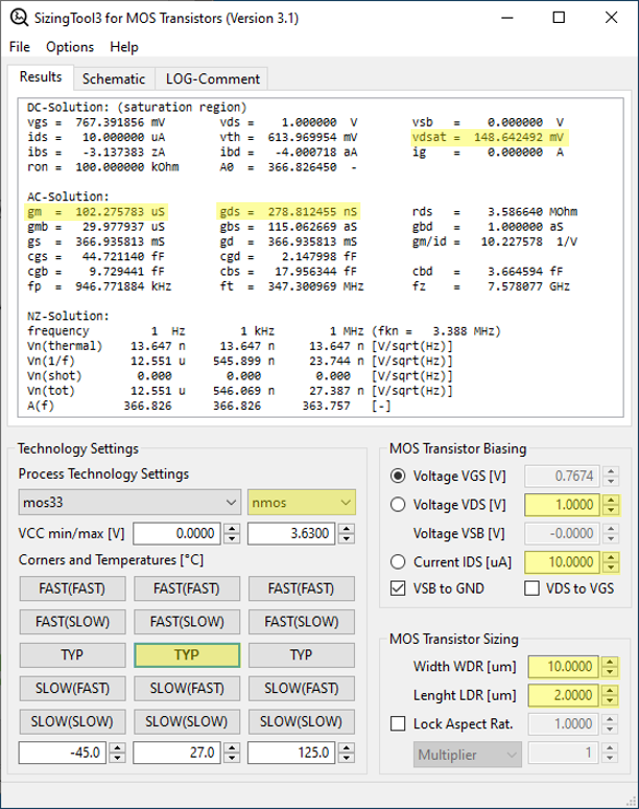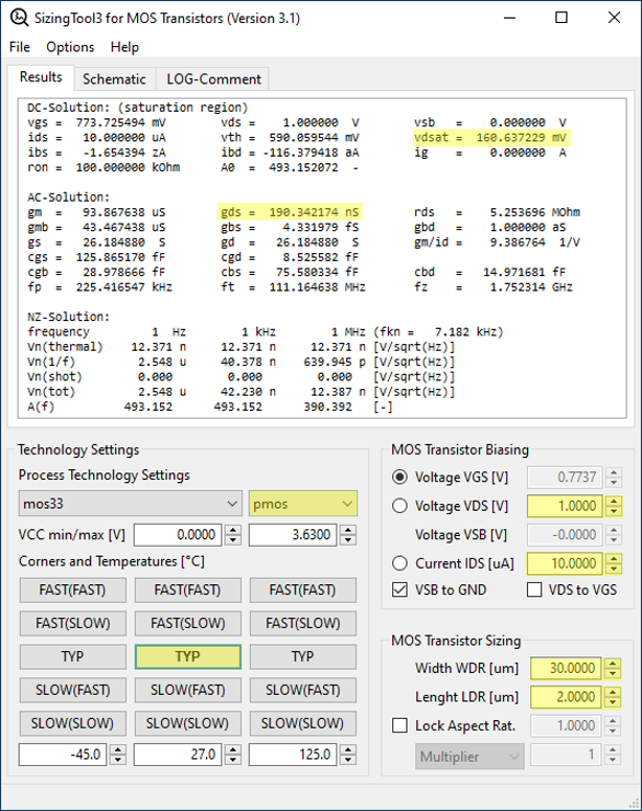 Therefore, we need to select an appropriate current density \(I_{DS}/W\) and adjust the transistor length until the values of \(g_{ds}\) and \(V_{dsat}\) meet the specified requirements. In our example, we chose a current density of 1 \(\mu A/\mu m\) for the n-channel transistor and 1/3 \(\mu A/\mu m\) for the p-channel transistor and achieved \(g_{ds}\) values less than 300 nS and \(V_{dsat}\) around 150 mV for typical conditions. While you can invest more effort in optimizing these values further, it’s important to consider process variations, shifts in biasing currents, and other non-idealities. Optimizations within a 20% margin are generally acceptable. Once you are satisfied with the results, you can adjust the width of the n-channel transistor while maintaining the current density constant until you achieve the desired transconductance. This adjustment will not alter \(V_{dsat}\) or \(g_{ds}\), as the current density and transistor length remain unchanged. Finally, adjust the width of the p-channel transistor so that the drain current \(I_{DS}\) provides the correct biasing current for the amplifier. Similarly, the current density will remain unchanged during this process. Fig. 2 and Fig. 3 illustrate the corresponding settings for the above examples.