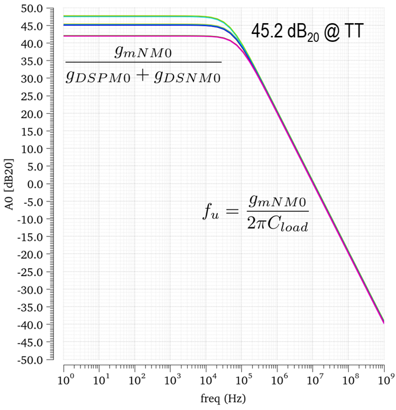 Given these values, we would expect an open-loop gain of around 46 \(dB_{20}\) under typical conditions. Regarding the output conductance, you can adjust the drain-source voltage \(V_{DS}\) accordingly in the tool and verify that none of the output conductances exceed 500 nS. Additionally, the unity gain frequency \(f_u\) is determined by the transconductance \(g_m\). If a constant-\(g_m\) biasing scheme is used, the unity gain frequency \(f_u\) will remain unchanged across different process corners. Conversely, the open-loop gain will vary, as the output conductance is related to the threshold voltage of the transistors, which is process-dependent.