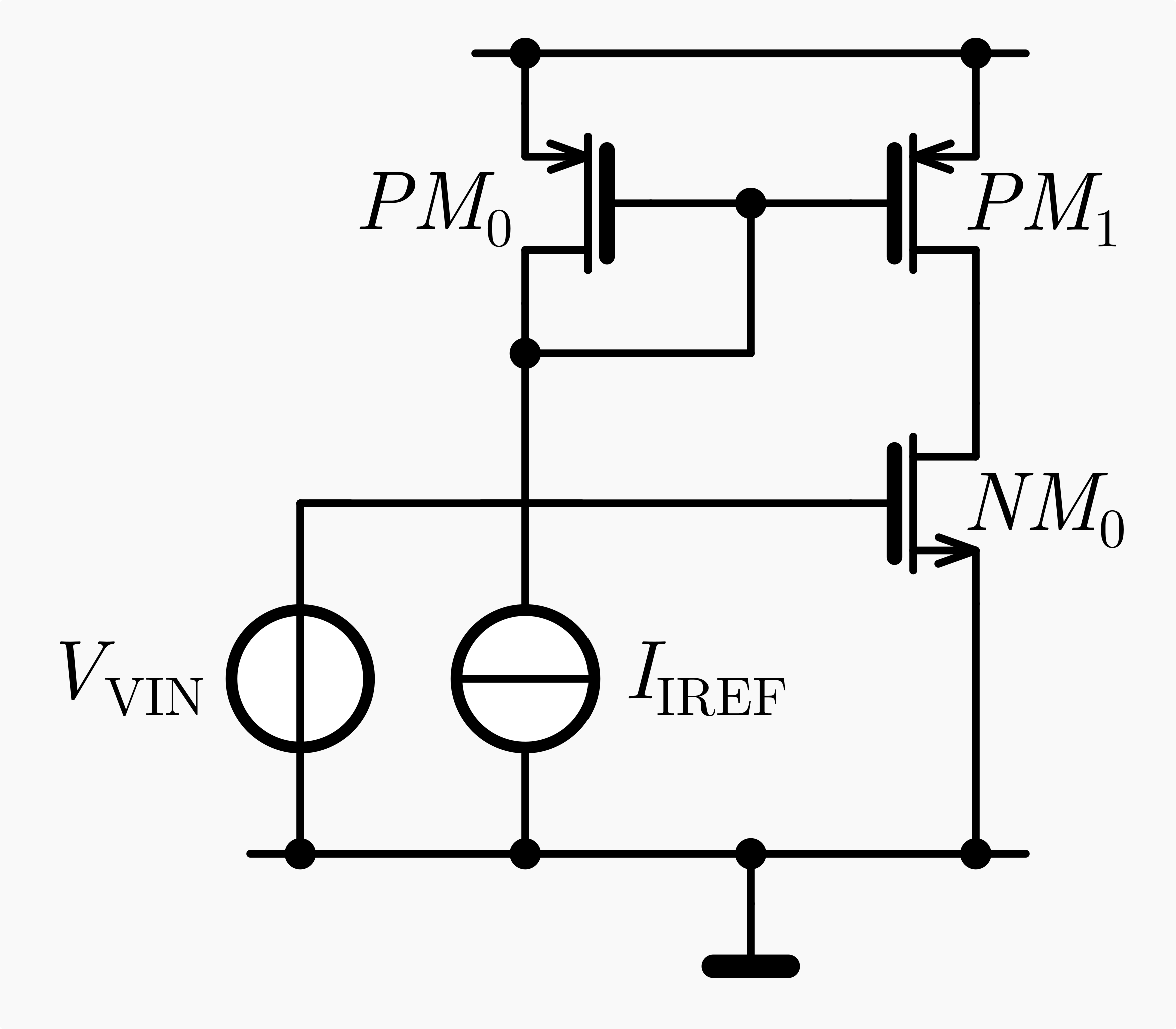 A common application of simple current mirrors is in single stage amplifiers with an active load. This common-source configuration (see Fig. 1) is highly favored as a gain stage, especially when high input impedance is desired. The term “common source” refers to the common node between the input and output voltages, which is the source terminal. In this example we use an n-channel transistor as the amplifier and a p-channel transistor as the active load. The p-channel transistor delivers a controlled bias current to the amplifier transistor. This active load acts as a current source, providing a high impedance output load without the need for a large resistor.