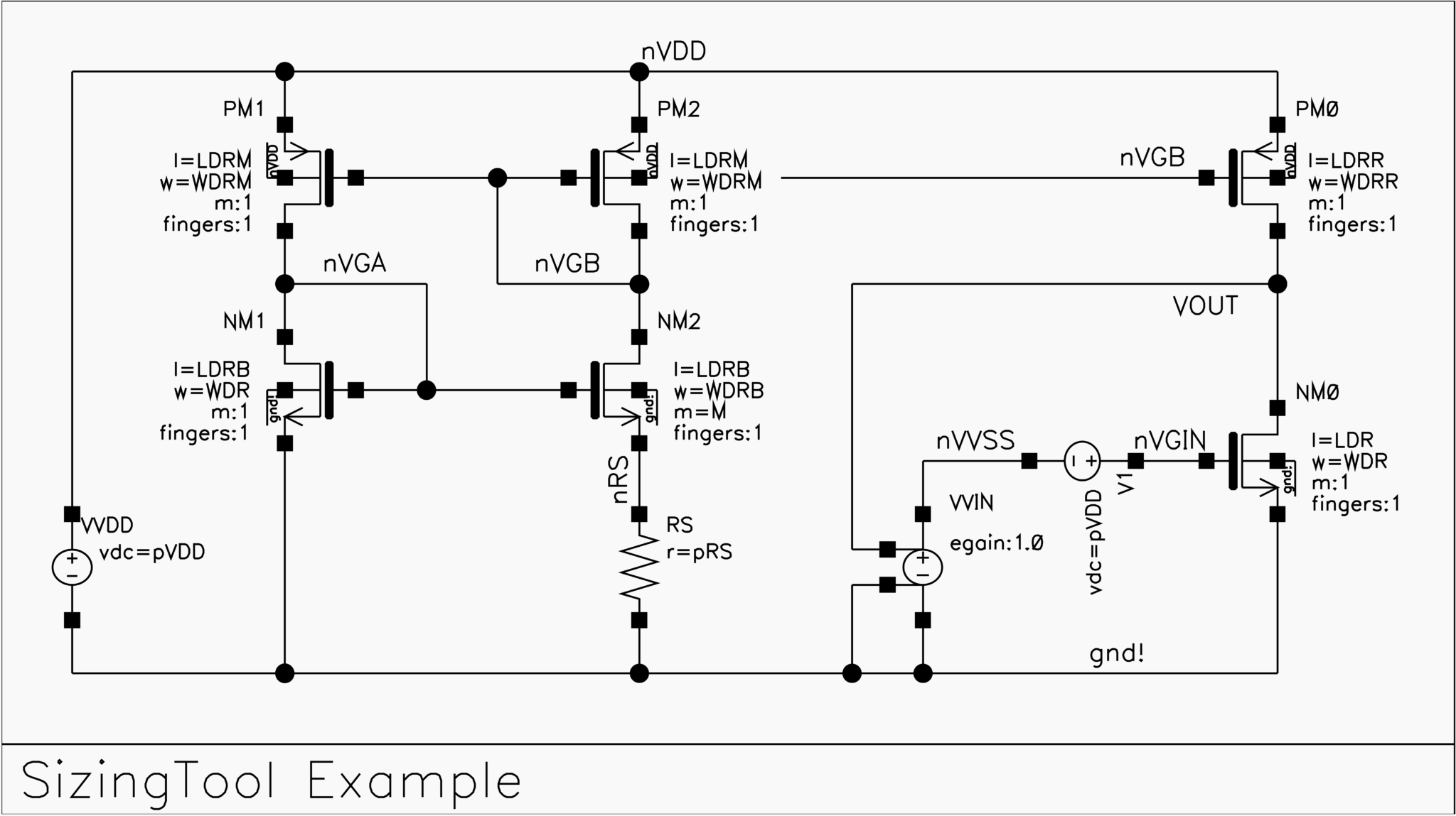 To set the appropriate gate voltage for the n-channel transistor, we use a feedback loop from the output node. In the given schematic, this is realized with a voltage-controlled voltage source. In the example, the loop gain is set to one, so the voltage source could be omitted. However, the testbench becomes more generalized, allowing easy adjustment of other feedback ratios.