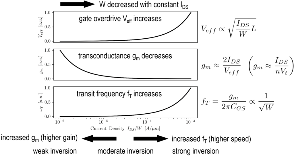 In Fig. 1 an overview is given, how current density \(I_{ds}/W\) affects drain-source saturation voltage \(V_{dsat} \approx V_{eff} = V_{GS} – V_{TH}\), transconductance \(g_m\), and transit frequency \(\omega_T = 2 \pi f_T\).