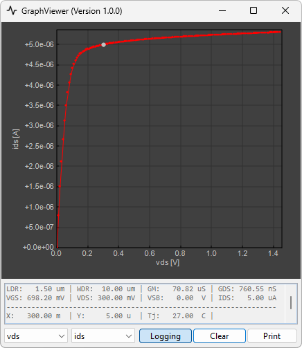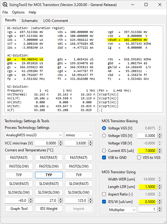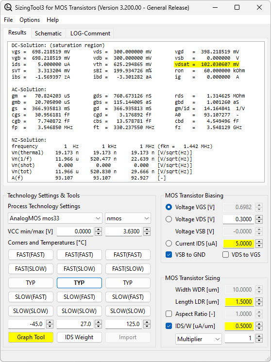 SizingTool3 provides a convenient method for selecting the correct dimensions of a MOS-transistor for given specifications such as transconductance \(g_m\), output conductance \(g_{ds}\), intrinsic gain \(A_0\), etc. In this example, we assume that previous analysis has shown that we need a transistor that operates so that it provides a transconductance \(g_m\) of \(100 \mu S\) at a drain-source voltage \(V_{ds}\) of \(300 mV\) and a reasonable output conductance \(g_{ds}\) to achieve an intrinsic gain \(A_0 \approx 100\). We conclude that the output region of the transistor requires a \(V_{dsat} = 100 mV = V_{ds} – 200 mV\). As shown in Fig. 2, we select in SizingTool3 the voltage \(V_{DS} = 0.3 V\), the current \(I_{DS} = 5.0 \mu A\), and adjust the length \(L_{DR}\) and the ratio \(I_{DS}/W\) until \(v_{dsat}\) and \(A_{0}\) give the correct value. Using the GraphViewer (see Fig. 3) we see that at \(V_{DS} = 0.3 V\) the \(I_{DS}(V_{DS})\) has flattened out and will give a reasonable output conductance \(g_{ds}\). Next we increase the current \(I_{DS}\) until the transconductance \(g_m\) shows the correct value of \(100 \mu S\). As shown in Fig. 4, a current of \(I_{DS} = 7.0 \mu A\) and a width \(W\) and length \(L\) is the correct choice for the transistor. The procedure can be repeated at different process corners and junction temperatures to ensure the correct specification is achieved over all PVT’s (Process – Voltage – Temperature). Further, you can select the ‘Lock Aspect Ratio’ option and readjust dimensions (w/o affecting \(g_m\), \(g_{ds}\)) in order to meet additional requirements such as noise or parasitic capacitors.