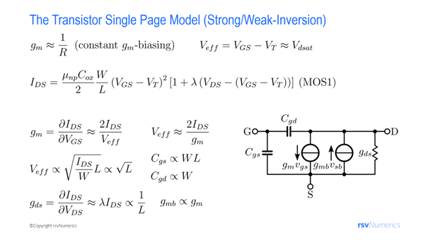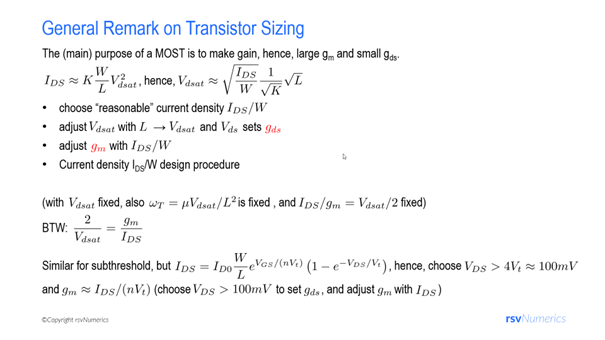 lacks a threshold voltage, and consequently voltage \(V_{dsat}\). Here, the thermal voltage is expressed as \(V_{th} = kT/q\). In sub-threshold, the drain-source saturation voltage is replaced by the ‘normalised’ transconductance \(g_m/I_{ds}\). Numerically, the correspondence of \(2/V_{dsat} = g_m/I_{ds}\) given in the saturation mode of the transistor is approximately maintained in the subthreshold mode. Therefore, we can choose a \(g_m/I_{ds}\) by adjusting an appropriate length \(L\) for a given current density \(I_{ds}/W\). Now, the given ‘normalised’ transconductance \(g_m/I_{ds}\) guarantees sub-threshold operation, and as long as the drain-source voltage is \(V_{ds} > 4 V_th \approx 100 mV\), we can expect a high output transconductance (in the drain-source current relation, the term \(1- exp(-V_{ds}/(nV_{th}))\) is close to 1, so \(g_{ds}\) will be very large). Similar to the saturation regime, we can adjust the output conductance \(g_{ds}\) with length \(L\) at constant current density \(I_{ds}/W\).